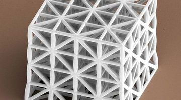 A hexagonal microtruss structure. According to the researchers, a structure like this, with a density significantly less than liquid water, can have a compressive strength of up to 55 MPa at 410 kg/m3 (with a 200 nm coating of alumina).