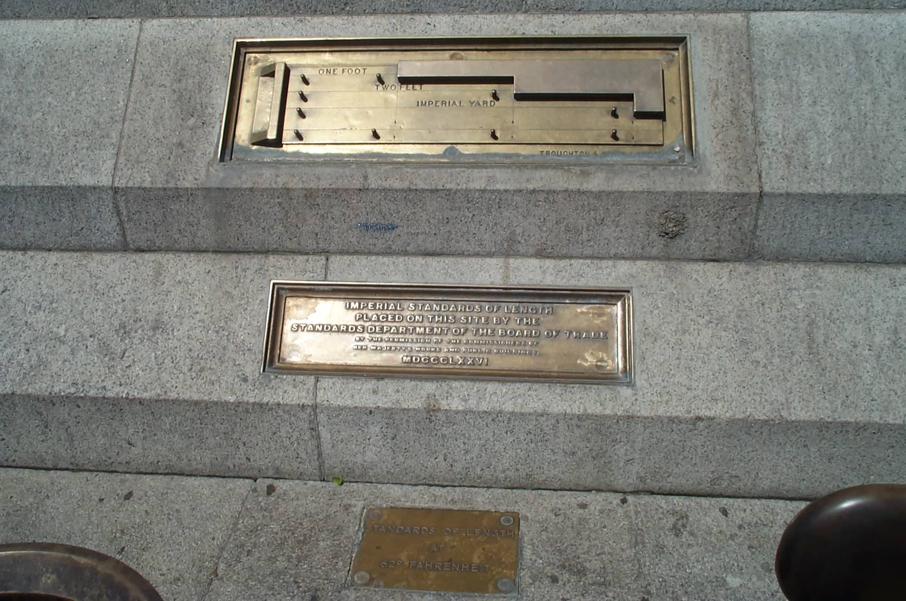 Brass plaques are installed in London’s Trafalgar Square showing the imperial units of the foot, 2 feet and 3 feet (yard).