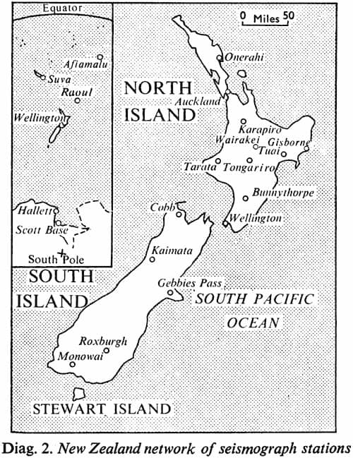 Diag. 2. New Zealand network of seismograph stations', from An Encyclopaedia of New Zealand, edited by A. H. McLintock, originally published in 1966. Te Ara