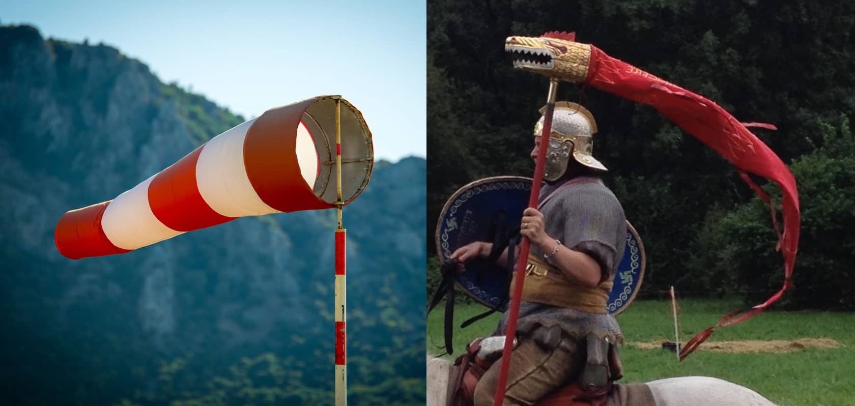 Modern windsock, Adaptice, 123RF Ltd. Roman military banner (or draco) in re-enactment, B.Codrin, Creative Commons 3.0