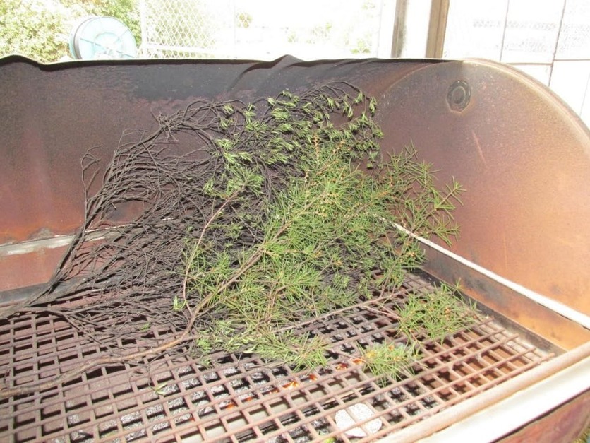 Samples of Hakea sericea (foreground) and Kunzea robusta (rear) arranged on the grill of our plant barbecue.