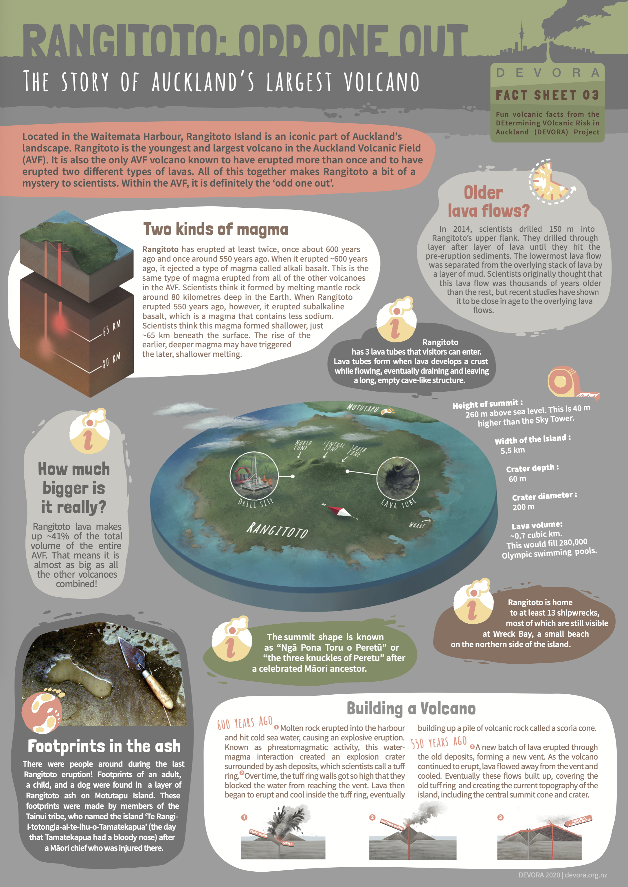 The DEVORA (DEtermining VOlcanic Risk in Auckland) programme brings together researchers from across Aotearoa New Zealand and beyond to assess volcanic hazards and risks in Auckland. As part of their outreach, the DEVORA team uses infographics to raise awareness about the Auckland Volcanic Field and the importance of understanding the local environment and landscape.